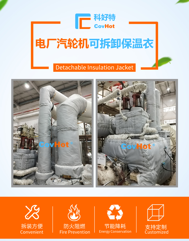 汽輪機可拆卸保溫衣采用可拆式拼接工藝制作而成,保溫層為獨立的保溫結構,可多次重復使用,可確保多次重復拆裝,約8~10年的使用壽命;